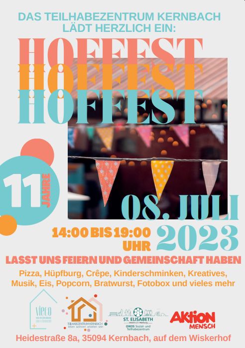 Wir wollen feiern und dankbar zurückschauen auf das vergangene Jahr! Seid herzlich eingeladen zum #HOFFEST2023 in Kernbach. Die Lebensgemeinschaft VieCo und das Teilhabezentrum Kernbach vom St. Elisabeth-Verein e.V. freuen sich sehr über euren Besuch, eure Mitarbeit und eure Mitfreude. Wo Fremde zu Freunden werden. Seid dabei! Übrigens: Wir brauchen noch Hilfe beim Mitarbeiten. Wer Lust und Zeit hat, darf sich sehr gerne bei uns melden. Schreibt eine Maill an: tschul.leuschner@vieco.org (Tschul Leuschner)