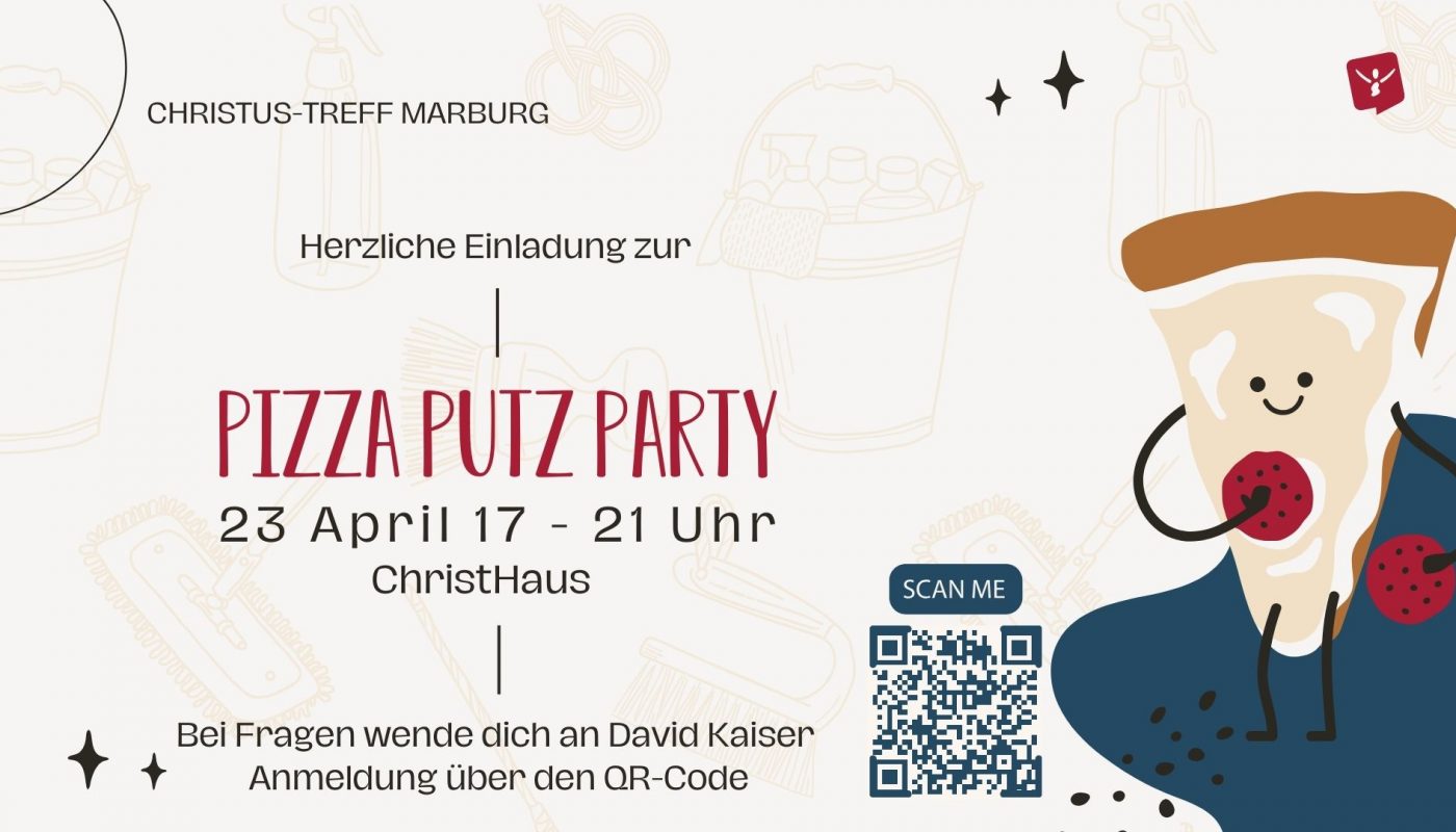 Herzliche Einladung zur Pizza-Putz-Party am 23.04. zwischen 17 und 21 Uhr! Unser ChristHaus freut sich über einen Frühjahrsputz! Wenn du gerne zusammen mit anderen Hand anlegen und unser Gemeindehaus wieder frühjahrsfrisch machen möchtest, dann melde dich bei David Kaiser über den QR-Code. Für das leibliche Wohl ist mit Pizza und Getränken gesorgt.