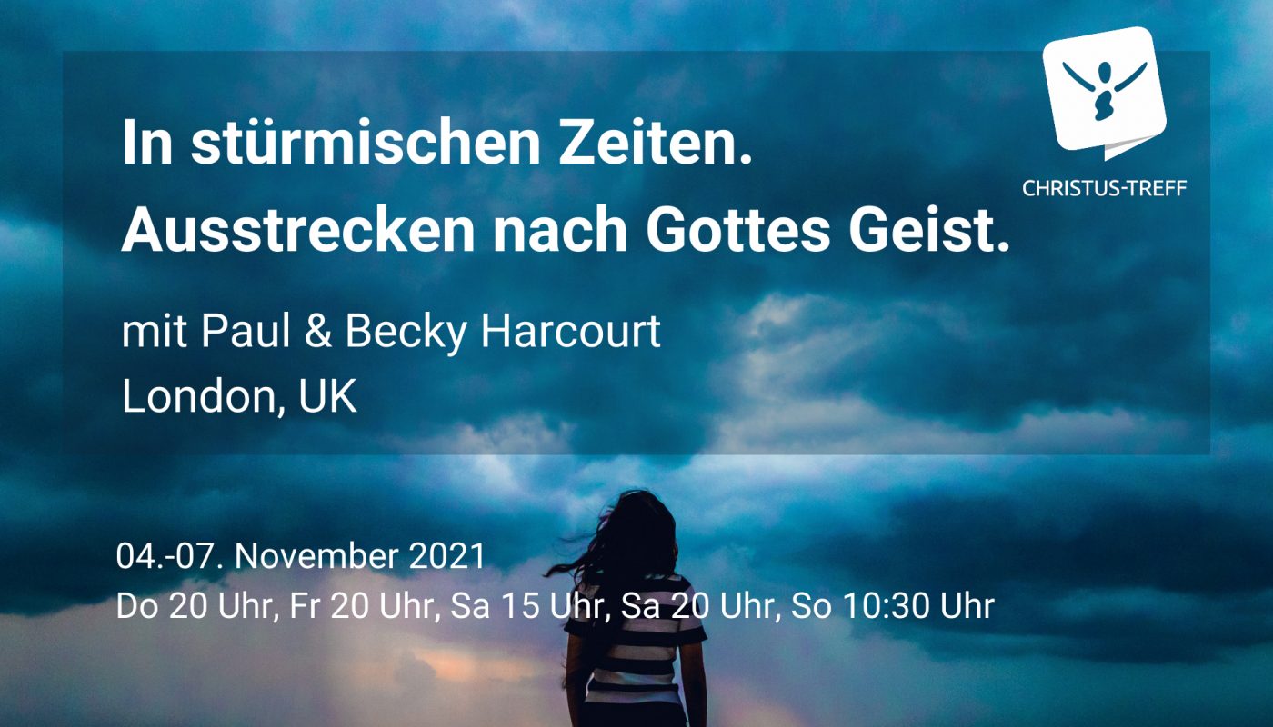 Wir freuen uns sehr, dass wir uns vom 4.-7. November als gesamter CT vier Tage Zeit nehmen können, um Gottes Wirken unter uns Raum zu geben. Die Tage „In stürmischen Zeiten. Ausstrecken nach Gottes Geist“ werden geprägt sein von den großartigen Impulsen des Referenten-Ehepaares Paul & Becky Harcourt. Paul ist anglikanischer Pastor bei All Saints‘ Woodford Wells im Nordosten Londons. Außerdem ist er Leiter des über England hinausreichenden Netzwerks „New Wine“, das Gemeinden befähigen will, ihre Gesellschaft und ihr Land zum Positiven zu verändern. Durch Becky & Paul angeleitete Anbetungszeiten, Inputs und Gebetzeiten wollen den Raum dafür öffnen, von Gottes Geist neu berührt, entfacht und verändert zu werden. Wir leben in „stürmischen Zeiten“ – als Einzelne und als Gemeinde. Deshalb erwarten wir von diesen Tagen Impulse, damit Verletzungen heilen können und wir wieder Zugang zu der Quelle finden, aus der wir Kraft und Orientierung für unseren Auftrag als CT in Marburg und darüber hinaus schöpfen können. Wir wollen die Zeit auch dafür nutzen, um uns als Gemeinde wieder neu miteinander zu verbinden, einander zu „sehen“ und ermutigt zu werden, wo wir Zuspruch brauchen. Dafür wollen wir uns gemeinsam nach Gottes Geist ausstrecken und ihn bewusst in die Stürme unseres Lebens einladen. Wir brauchen eine Erneuerung unserer Beauftragung für diese Stadt und darüber hinaus und erwarten, in diesen Tagen neu erfüllt zu werden mit der „Kraft aus der Höhe“. Start ist am Donnerstag, 4.11., um 20 Uhr mit dem CelebraTe-Gottesdienst in der Pfarrkirche. Weitere Termine (alle im Christ-Haus) sind: Fr. 5.11. um 20 Uhr, Sa. 6.11. ab 15 Uhr und ab 20 Uhr und am Sonntag, 7.11. im Gottesdienst um 10.30 Uhr. Nutzt die Gelegenheit und reserviere dir diese Tage, um Gott zu begegnen! Und bitte betet mit für die Tage, dass wir uns auf Sein Handeln unter uns vorbereiten. Dafür könnt ihr euch auch jetzt schon gerne im Büro melden. Weitere Infos findet ihr demnächst auf unserer CT-Homepage (Markus Heide und Daniel Meinzer).